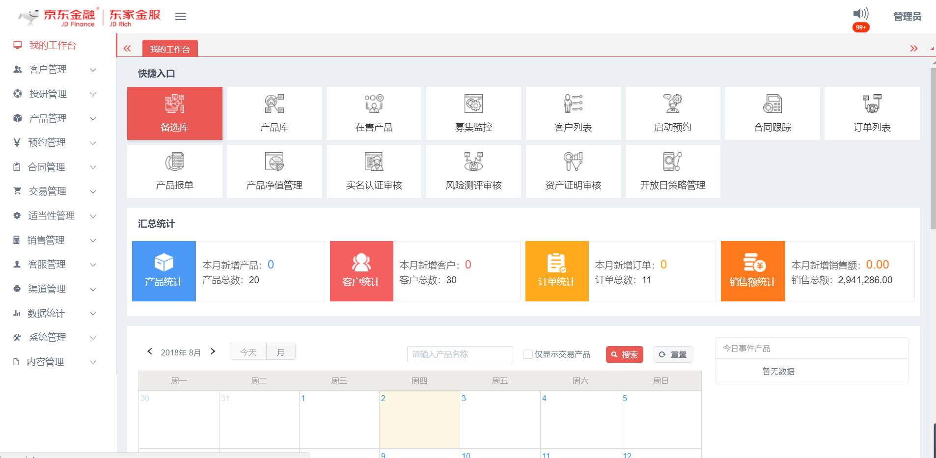 - 我的工作臺:提供系統菜單快捷入口,統計核心業(yè)務(wù)數據及開(kāi)放期內的產(chǎn)品日歷事件展示