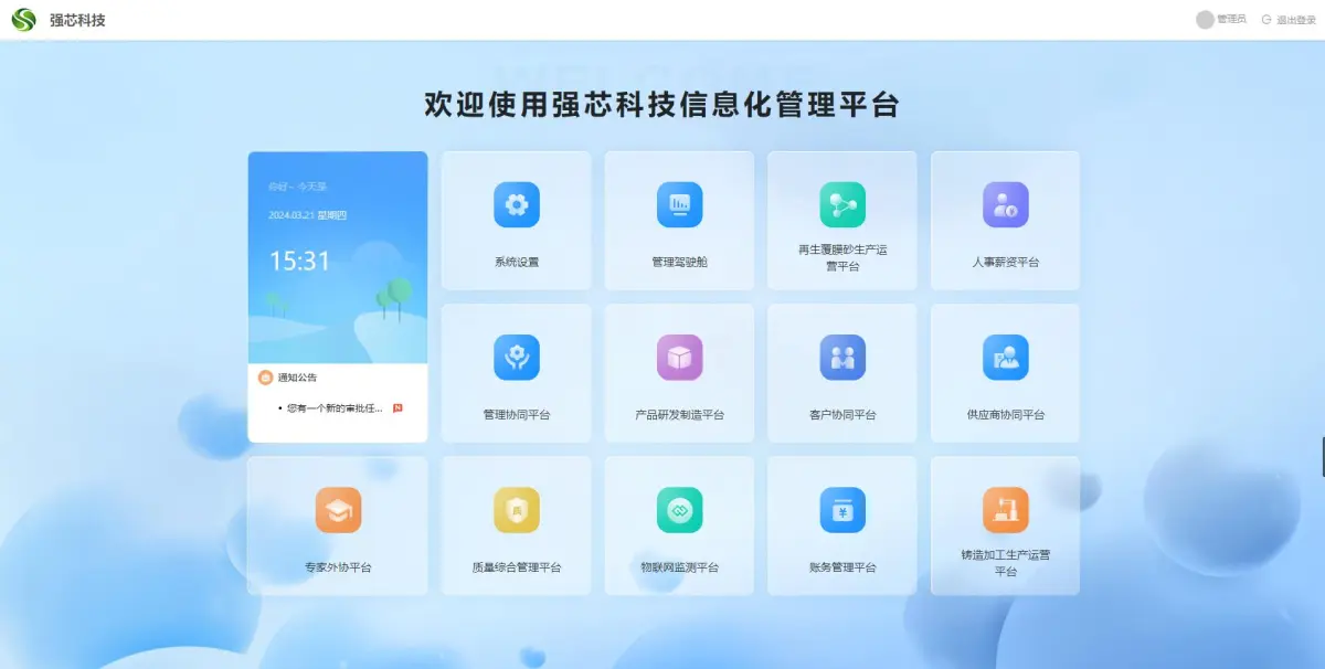 再生覆膜砂生產(chǎn)運營(yíng)平臺:工作日志、銷(xiāo)售管理、倉庫管理、采購管理、車(chē)間工廠(chǎng)、工作流、消息中心