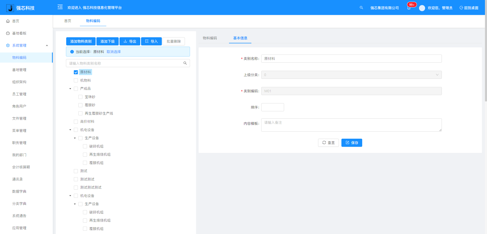 系統設置:物料編碼、基地管理、組織架構、員工管理、角色用戶(hù)、菜單管理、職務(wù)管理、會(huì )計核算期、授權設置